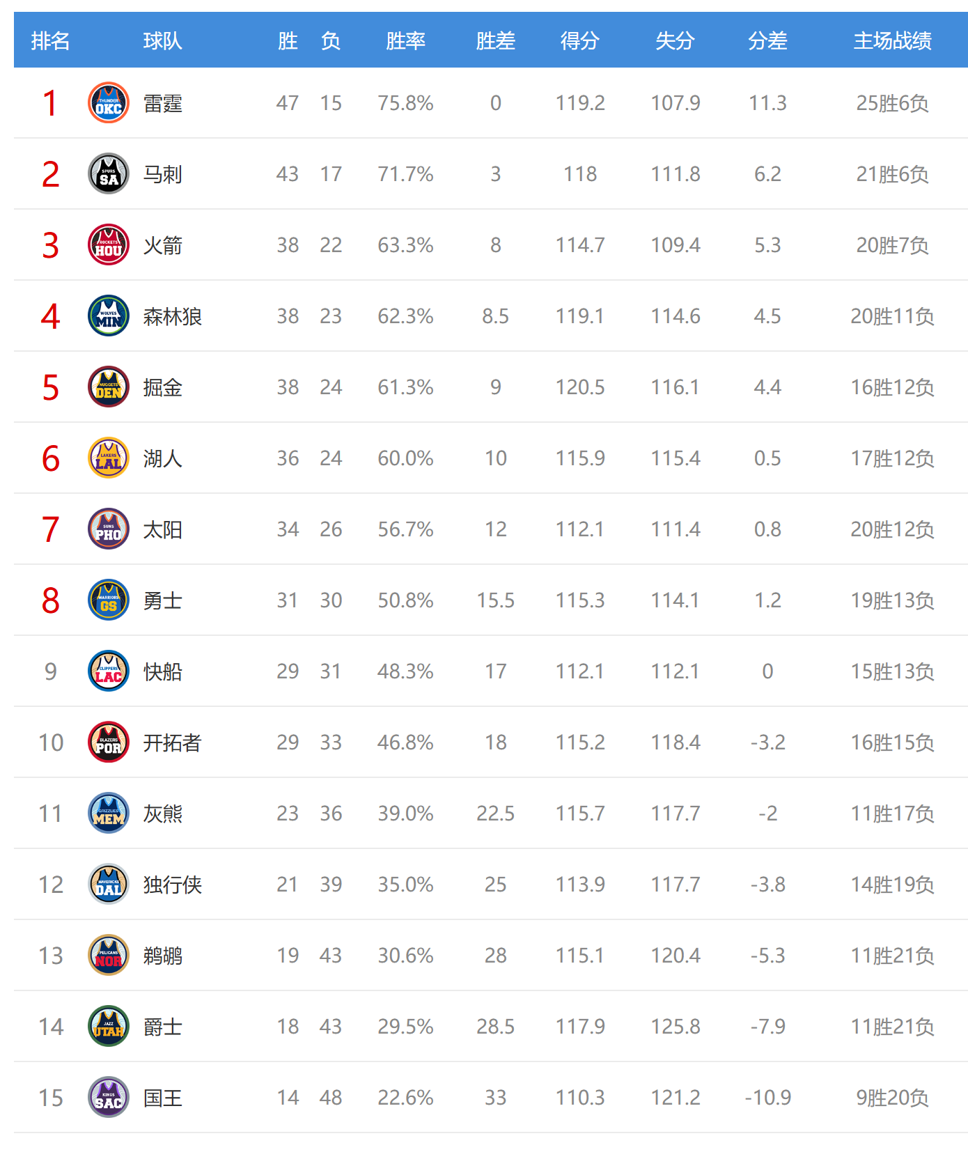今日比赛后西部排名没有变化,只是胜场差有所改变。